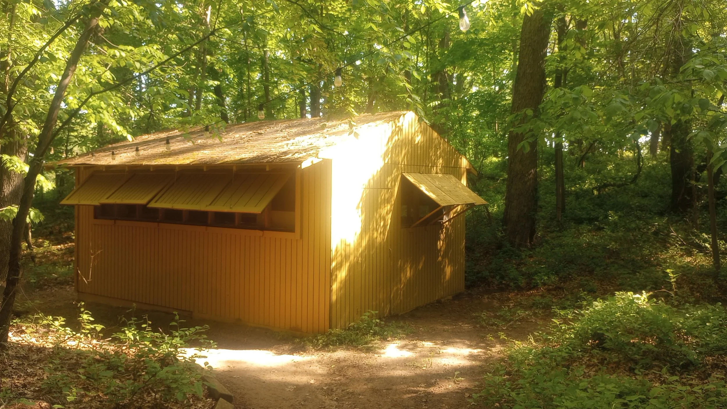 Our largest covered outdoor space is our Pavilion, which sits on a hill near the center of camp overlooking the soccer field and Pond. There’s a number of outlets, overhead lights, and a drinking fountain that’s hooked up in warmer months, typically May-October. A small number of benches and picnic tables are kept around the structure, which can be moved to sit around the campfire pit on the north side of Pavilion.